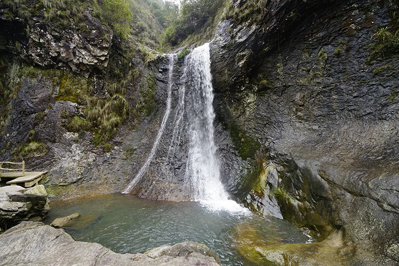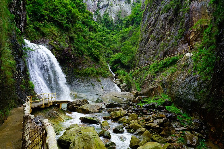 晴日里,瀑水溅起的碎珠在涧谷光影中折射出泠泠光泽,与崖壁青灰纹理相映成“涧光碎金”之景;雨雾时,水汽裹着林叶清气漫溢,与楠溪江特有的负氧离子交织,成了天然的“涧谷氧舱”。沿木栈步道临瀑而立,既能触碰到溪潭清冽的楠溪江水(国家一类水标准),又能听涧流与山风共鸣,恰是永嘉书院 “藏于谷,隐于林” 的秘境之美。